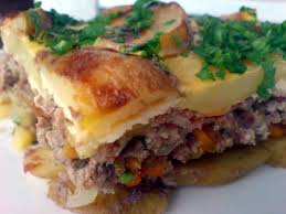 Баклажаны порезать пластиками или кружочками,посолить и оставить на время,чтобы ушла горечь.Потом дать стечь,обсушить бумажным полотенцем и слегка обжарить на растительном масле.Сырой картофель порезать кружочками и слегка обжарить на раст.масле.Порезать крупными кольцами репчатый лук и сладкий болгарский перец.Теперь нужно приготовить мясной фарш (кима). Фарш из любого мяса выкладываем на сковороду с высокими краями,добавляем оливковое масло,мелко порезанный репчатый лук,чеснок,петрушка,укроп,соль,перец-по-вкусу.Немного обжариваем,помешивая.Добавляем, измельченные свежие помидоры в таком количестве,чтобы было достаточно сока для тушения этого фарша.Тушим это до готовности.Можно добавить немного лимонного сока.